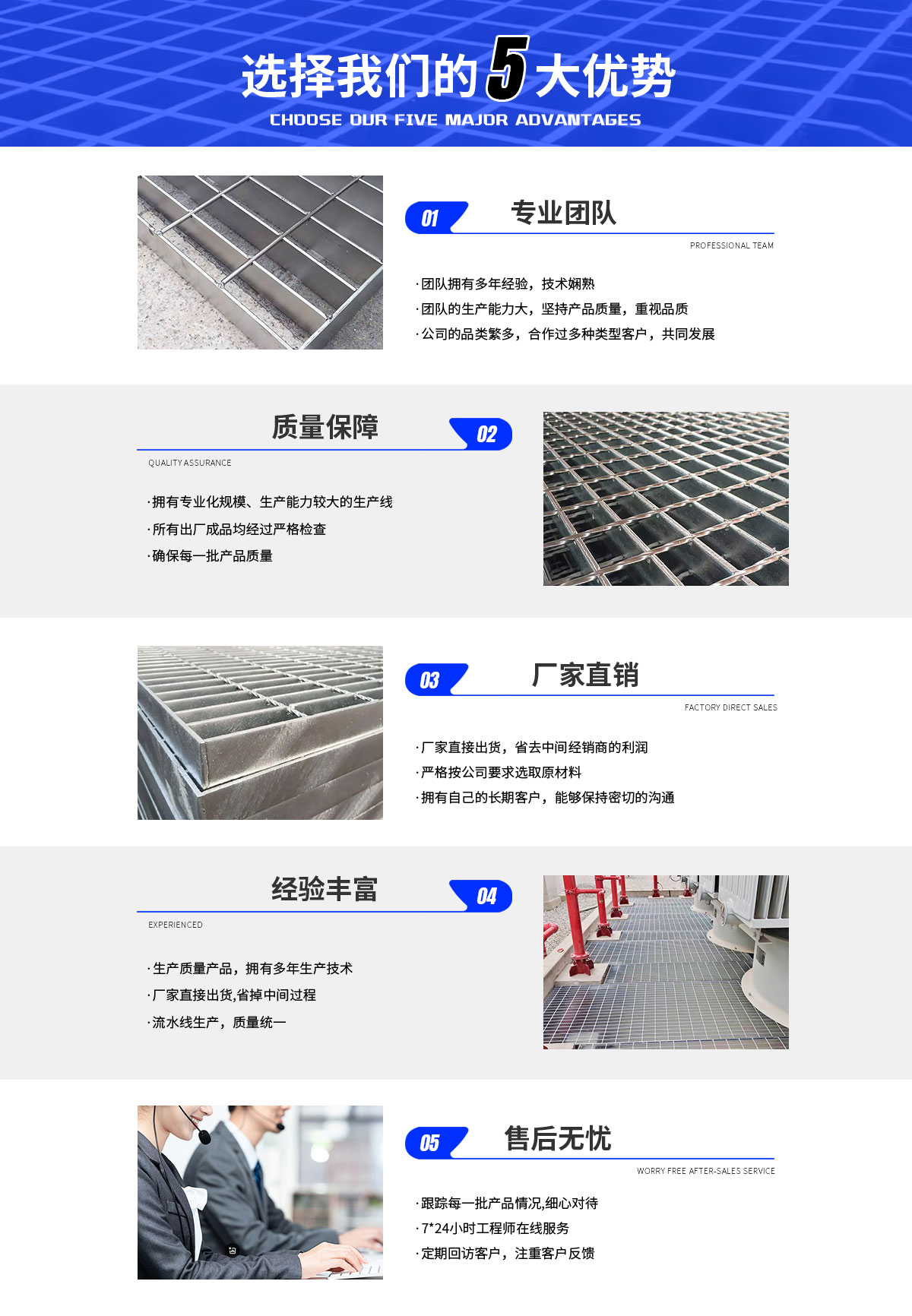 本廠生產(chǎn)船舶鋼格柵板、電廠鋼格柵板、光伏運(yùn)維通道踏板、鍋爐房鋼格柵板、化工鋼格柵板、化油池平臺(tái)鋼格板、烤漆房鋼格柵板、碼頭鋼格柵板、平臺(tái)鋼格柵板、橋墩鋼格柵板、停車場鋼格柵板、脫硫塔鋼格柵板、污水廠鋼格柵板、洗煤廠鋼格柵板、箱變平臺(tái)鋼格板、油田鋼格柵板、玻璃鋼格柵板、不銹鋼鋼格柵板、防滑鋼格柵板、復(fù)合鋼格柵板、鋼格柵板、鋼梯踏步板、熱鍍鋅鋼格柵板、水溝蓋板、壓鎖鋼格柵板、異形鋼格柵板、重型鋼格柵板、球形立柱等。采用全自動(dòng)大型壓焊生產(chǎn)線,美觀牢固。本廠始終堅(jiān)持"質(zhì)量好,用戶至上"的服務(wù)宗旨,贏得廣大用戶的贊譽(yù), 產(chǎn)品遠(yuǎn)銷大江南北